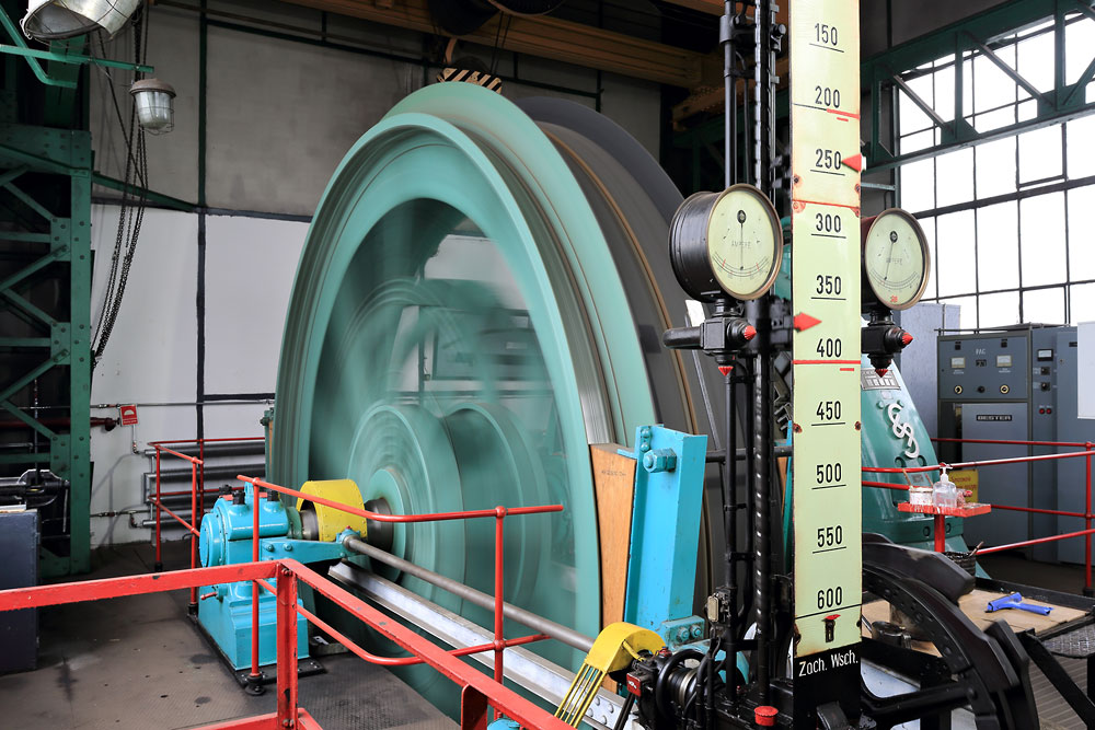 04/08/2017 | Machine d'extraction (poulie Koepe monocâble) du puits Wiktor ; au 1er plan l'indicateur de profondeur
