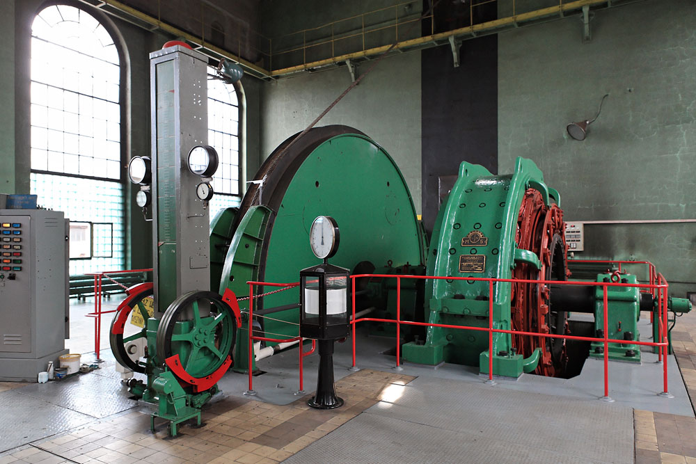 30/08/2013 | Siège Mysłowice - Machine d'extraction (poulie Keope) du puits Łokietek ; à gauche l'indicateur de profondeur