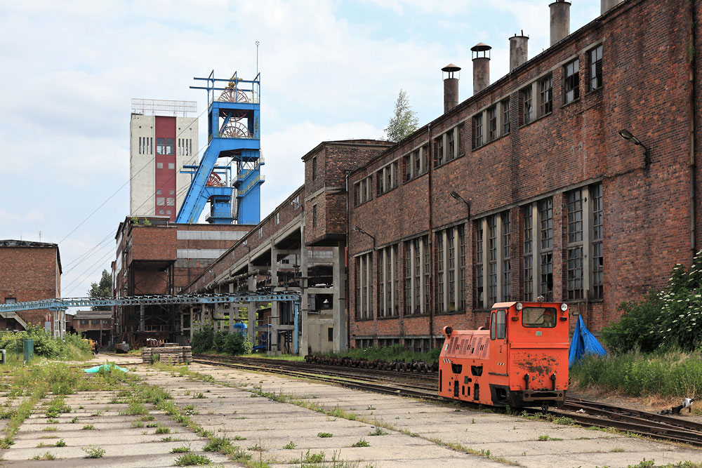 09/06/2015 | Siège Wesoła - Le carreau principal et ses 3 puits ; au 1er plan une petite loco diesel pour le transport du matériel