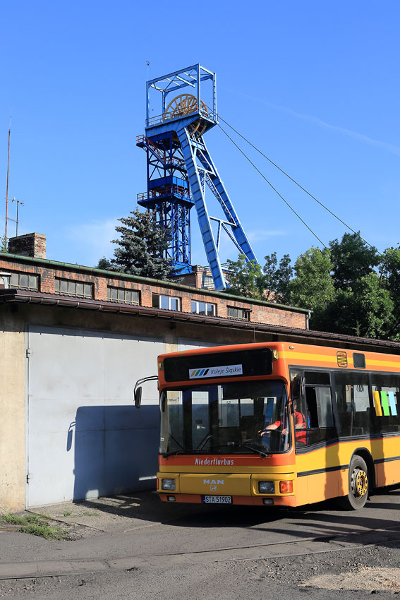 03/08/2017 | Bus pour le transport des mineurs vers le puits Dolki devant le chevalement du puits Julian IV