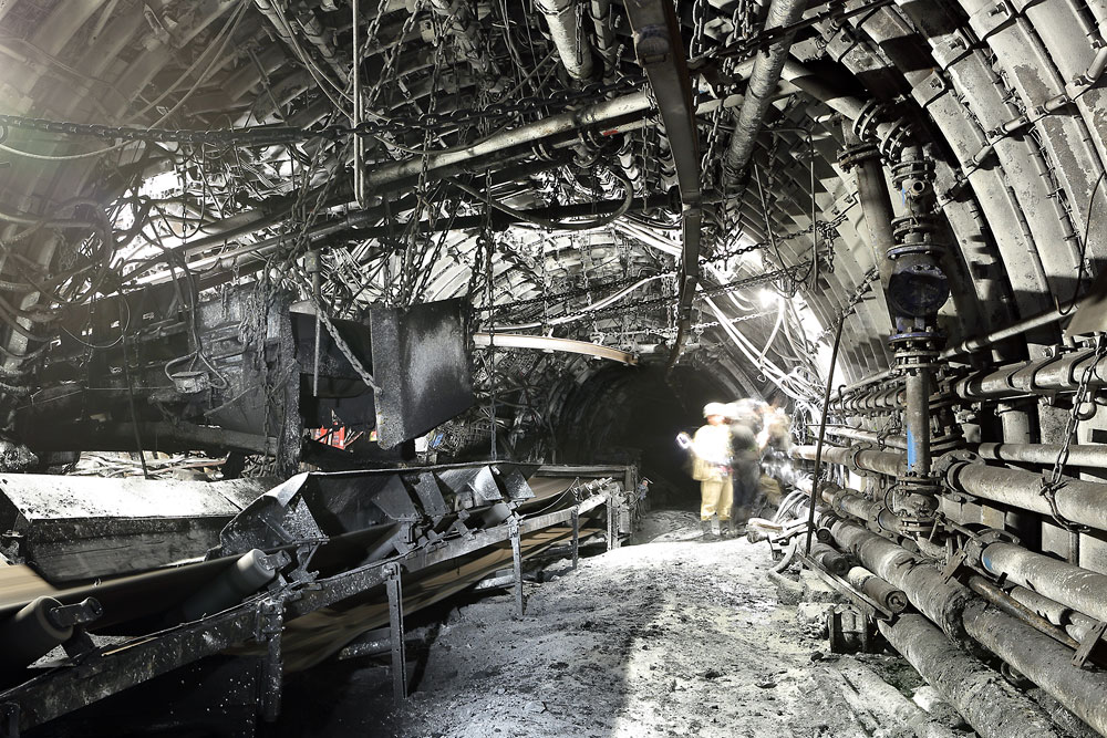02/08/2017 | Le convoyeur en provenance de la taille (à gauche) déverse le charbon sur un convoyeur à bande
