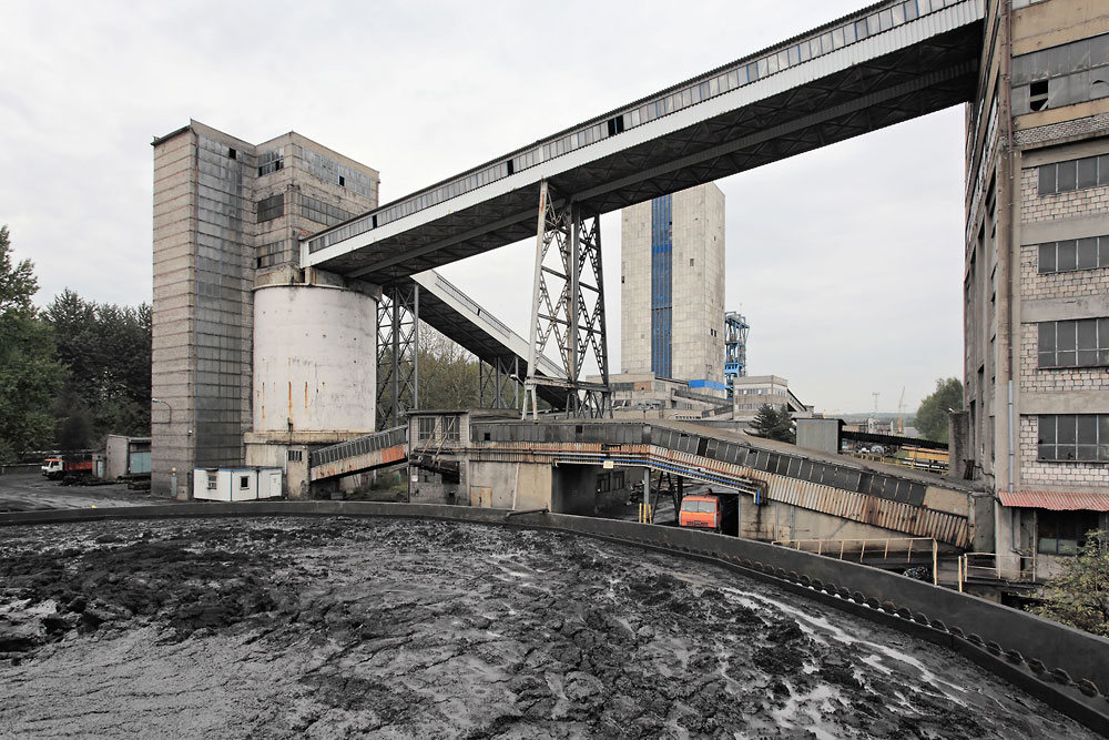 25/09/2015 | Siège Śląsk : silos de stockage du charbon brut et tour d'extraction du puits II vus depuis un décanteur du lavoir