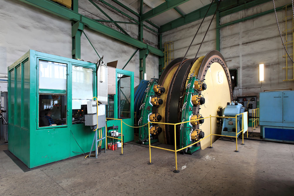 25/09/2015 | Siège Śląsk : machine d'extraction 'ouest' du puits I (poulie Koepe bicâble) ; à gauche la cabine du machiniste