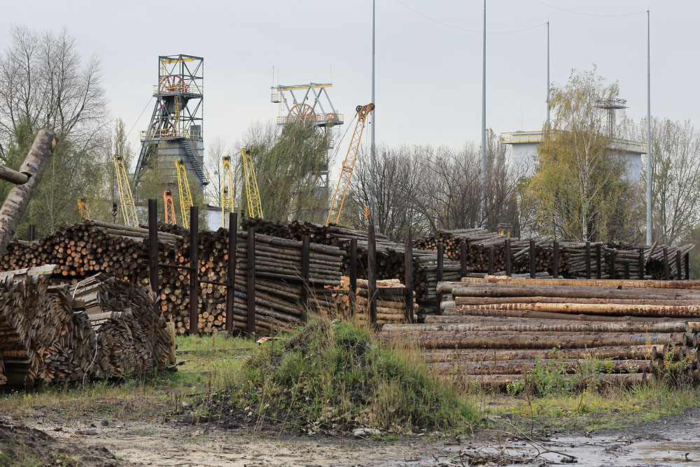 31/10/2017 | Siège Wujek : parc à bois ; en arrière plan chevalements des puits d'aérage II et I