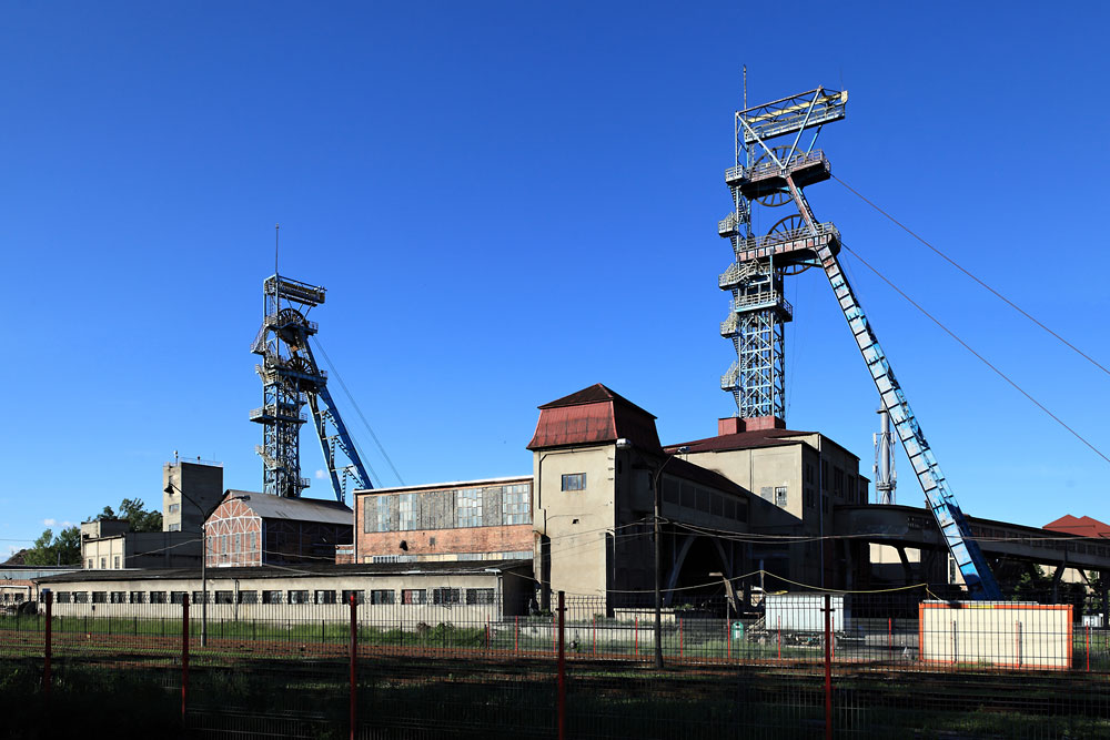 31/05/2013 | Vue générale sur les 3 puits : tour d'extraction du puits I, chevalement et recette du puits II, chevalement et recette du puits III