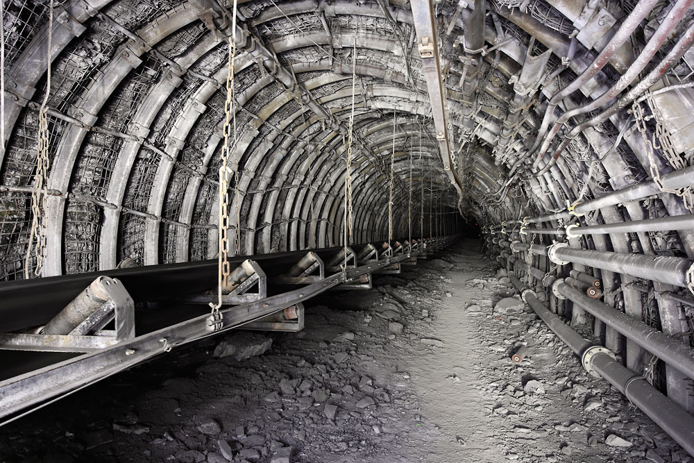 09/10/2014 | En chemin vers la taille, le long d'un convoyeur à bande ; notez la déformation du toit sous l'effet des pressions de terrain