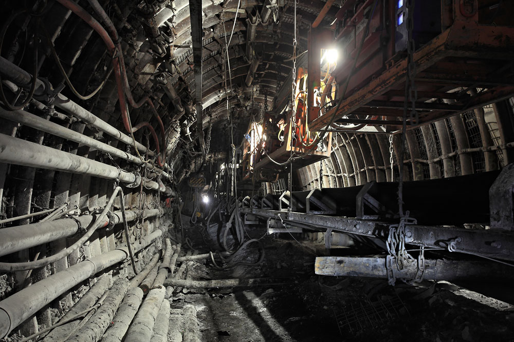 09/10/2014 | En voie de base, près de la taille ; les groupes hydrauliques du soutènement marchant sont suspendus au toit de la galerie