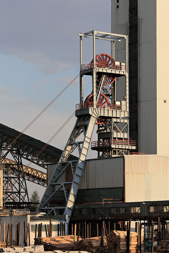 30/08/2013 | KWK Halemba-Wirek, siège Halemba : chevalement et recette du puits Grunwald IV ; au 1er plan le parc à bois