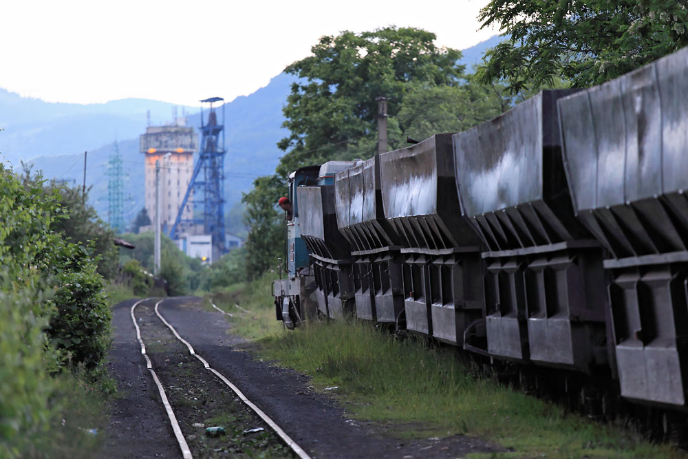 10/06/2014 | Mina Lonea : un train de wagons vides remonte vers la mine dont on aperçoit 2 puits / Chemin de fer Petrila-Lonea