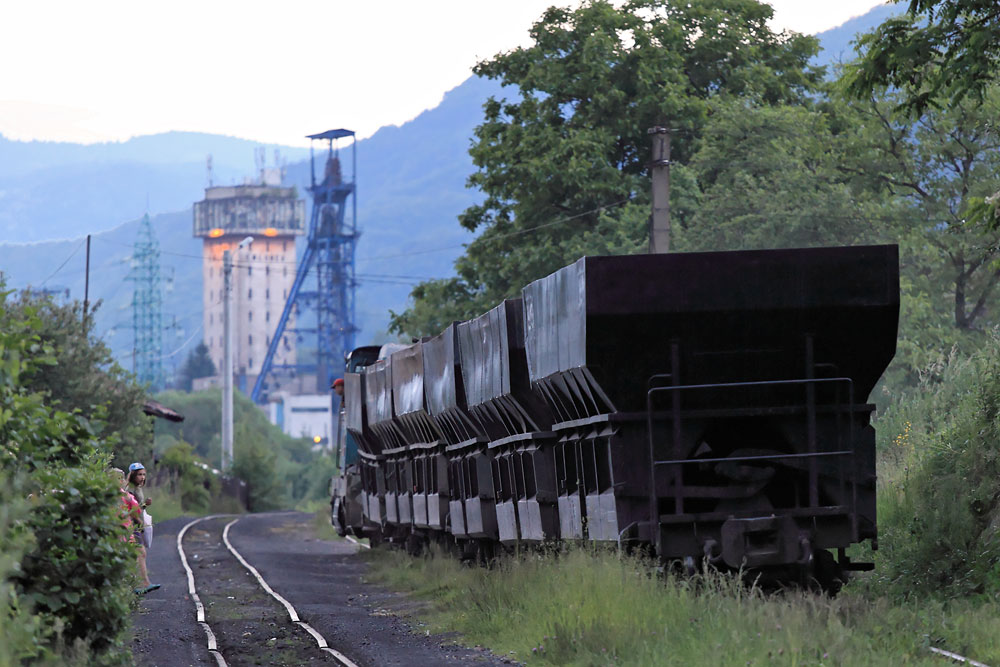 10/06/2014 | Mina Lonea : un train de wagons vides remonte vers la mine dont on aperçoit 2 puits / Chemin de fer Petrila-Lonea