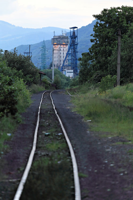 10/06/2014 | Mina Lonea : chemin de fer à voie étroite Petrila-Lonea ; on aperçoit au fond 2 puits de la mine Lonea
