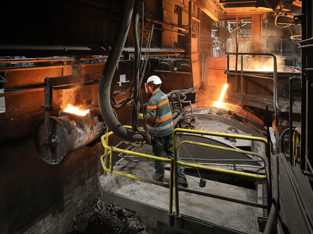 Hot-blast cupola furnace tapping - taking a sample in a transfer ladle