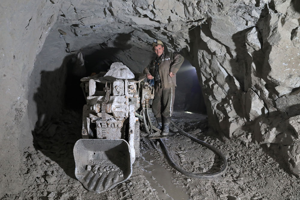29/03/2023 | Un mineur prend la pose sur une pelle à air comprimé sur pneu (chargement de la magnésite)