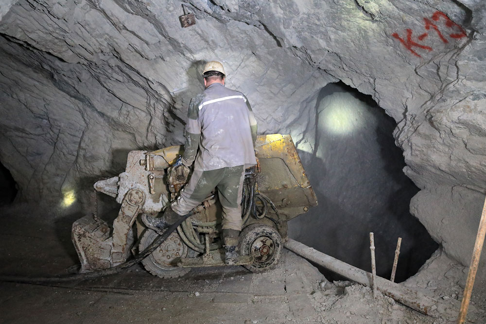 29/03/2023 | Un mineur présente une pelle à air comprimé en marche arrière pour vider la magnésite dans un puits de jet