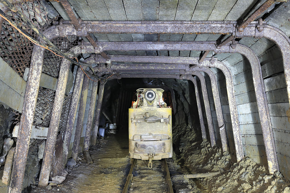 29/03/2023 | Loco diesel en tête d'un train de berlines chargées sur le roulage principal (niveau 0)