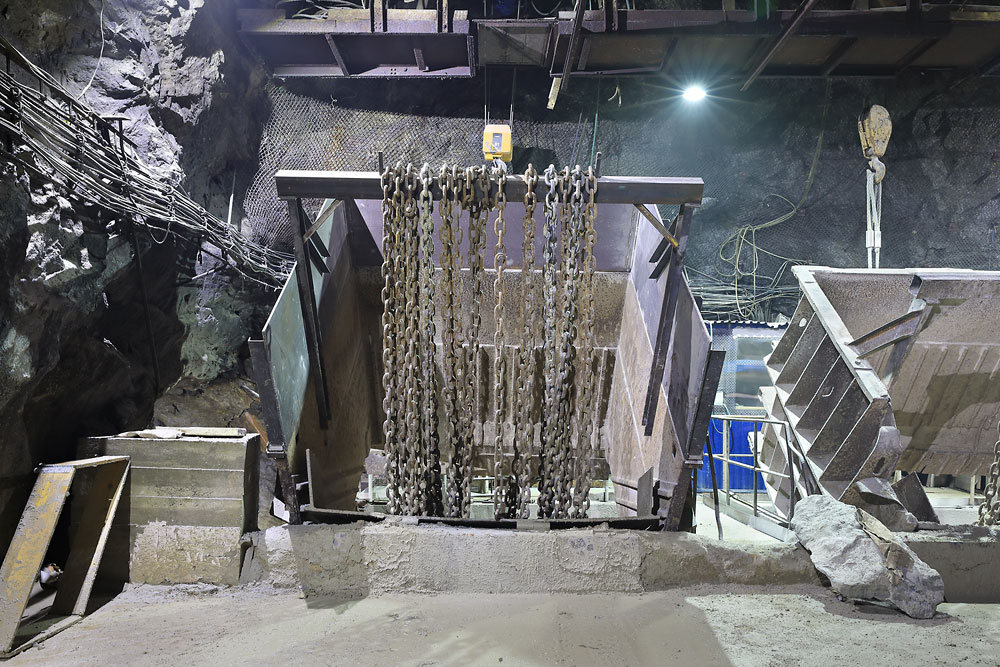 28/03/2023 | Le roulage, au fond : trémies pour le chargement des trains ; les camions chargés de minerai brut y déversent leur cargaison