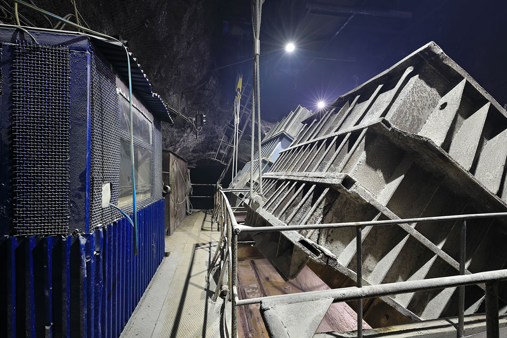 28/03/2023 | Le roulage, au fond : trémies pour le chargement des trains ; les camions chargés de minerai brut y déversent leur cargaison