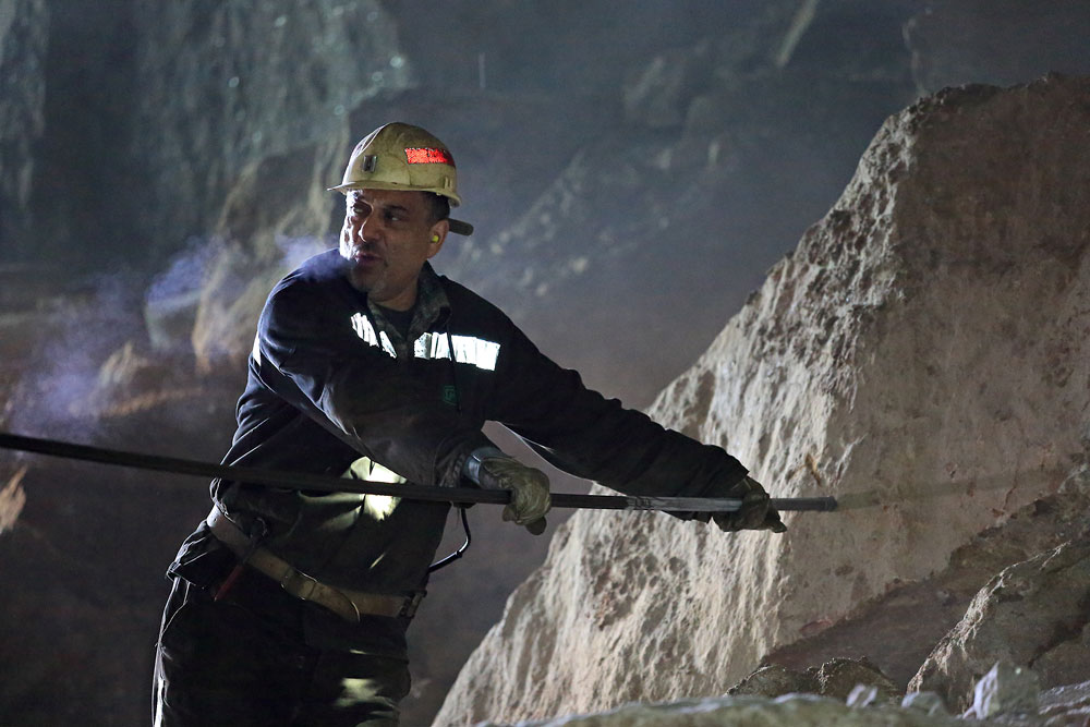28/03/2023 | Foration au marteau-poussoir d'un gros bloc, dans un chantier exploité en chambres et piliers abandonnés